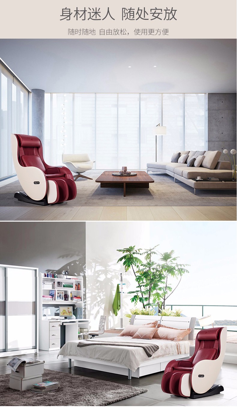 额定功率:95w 额定电压:220v50hz 定时:10/20/30 尺寸:椅背直立:112.5*68.5*111.5cm 椅背后仰:140.8*68.5*77cm 净重:约50kg 专利东方手感超薄按摩机芯 超长L型曲线导轨 按摩轮加热按摩 座部、腿部气压按摩 零重力、音乐按摩放松身心 时尚外观 家居首选